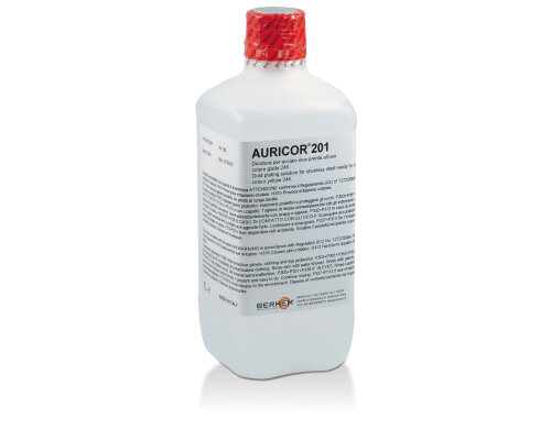 AURICOR 201 is a strongly acid gold solution which acts as a primer for metal surfaces where deposition is difficult like stainless steel. This deposit facilitates subsequent plating treatment ensuring long-term stability and durability